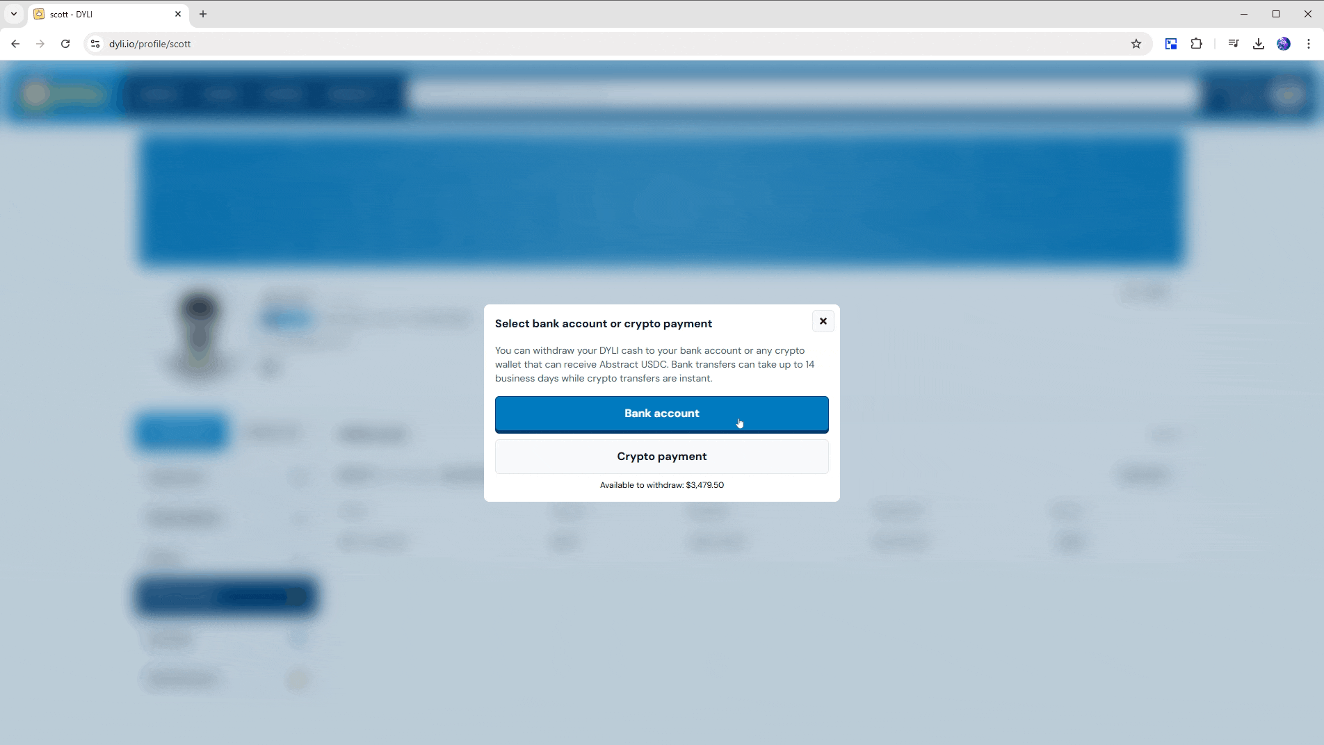 * Once an account is linked, you can select it, input the amount to withdraw, and confirm you withdrawal. You can then track its processing on the Withdrawals tab of [your-profile](https://docs.dyli.io/core-features/your-profile "mention").  ACH transfer requests can take up to 7 business days.