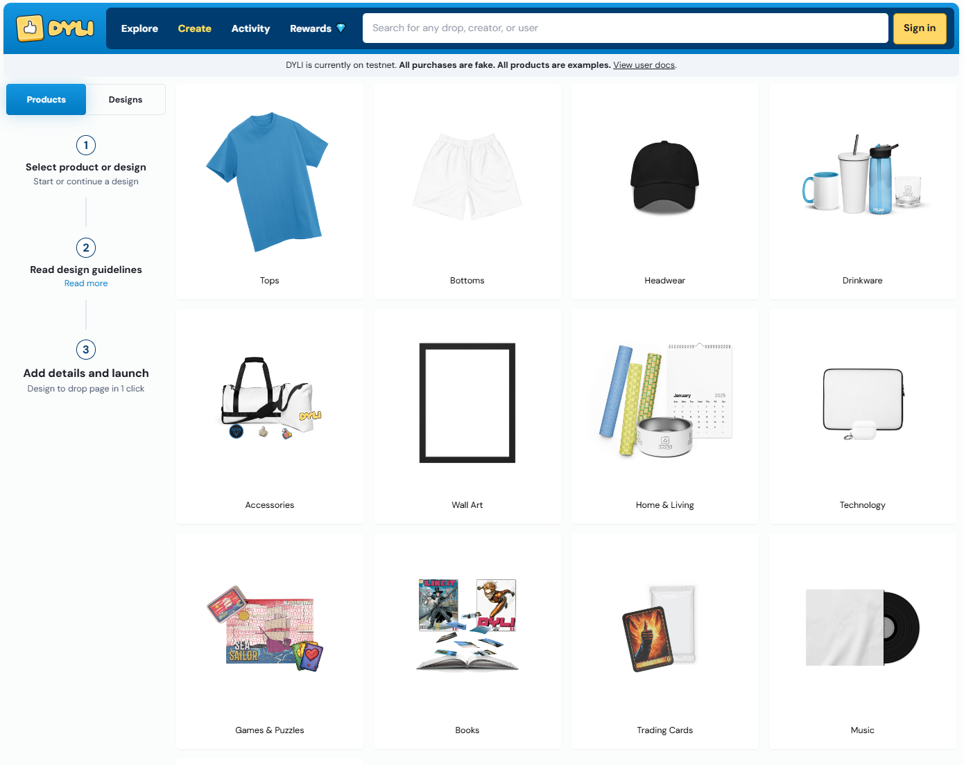 Select a product to explore the available [bring-your-own](https://docs.dyli.io/get-started/seller-hub/creator-studio/bring-your-own "mention")techniques and choose from various options like colors and sizes to bring your design to life just the way you envision it.